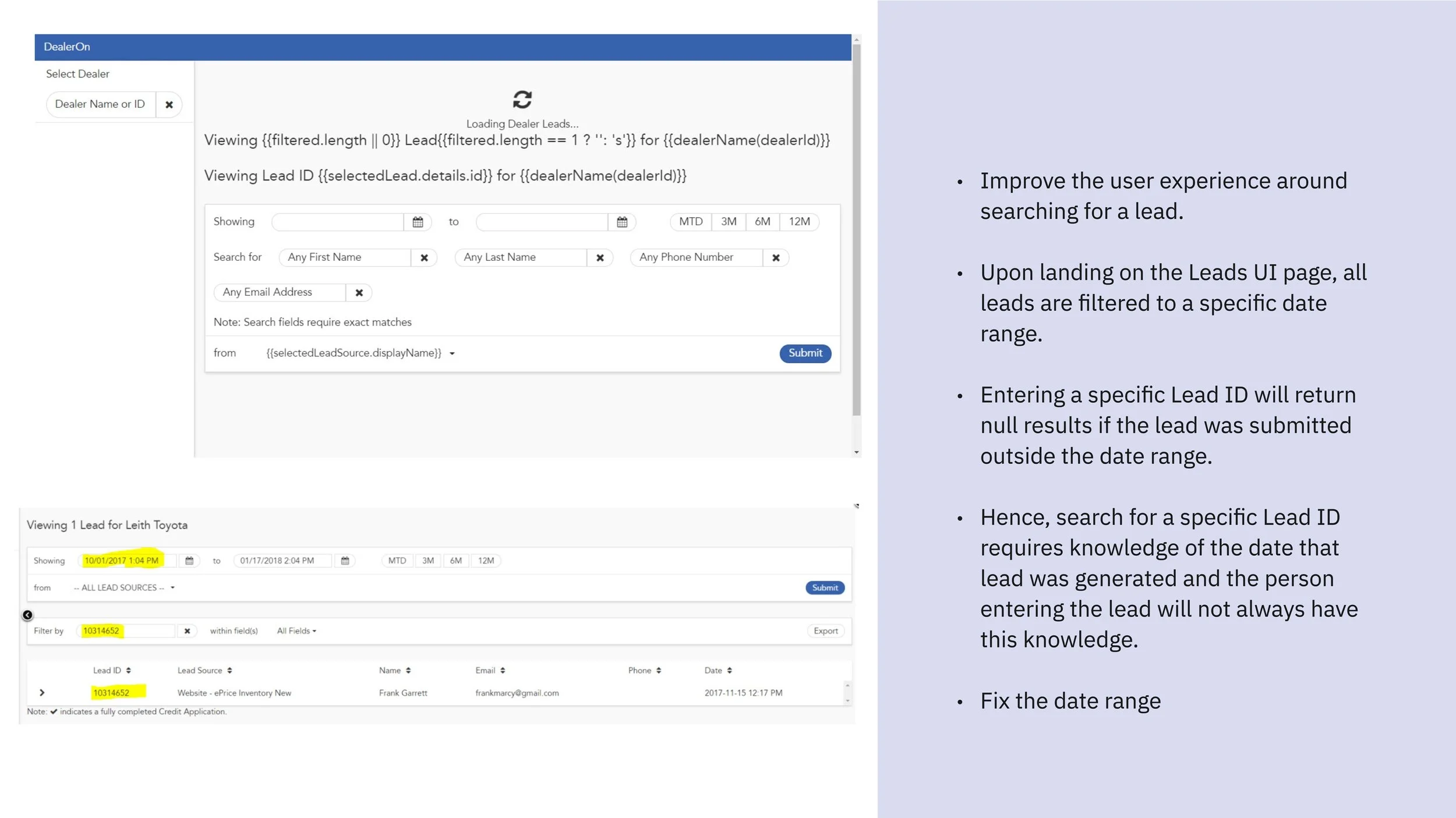 Based on the research I needed a representation of the ideas. This helped give a visual representation and a clear understanding of the functionalities and designs that the Lead Management System needed to support. Went back and forth collaborating with Dealeron internal users, developers, OEM, CMS (Customer Management System), and Product managers.