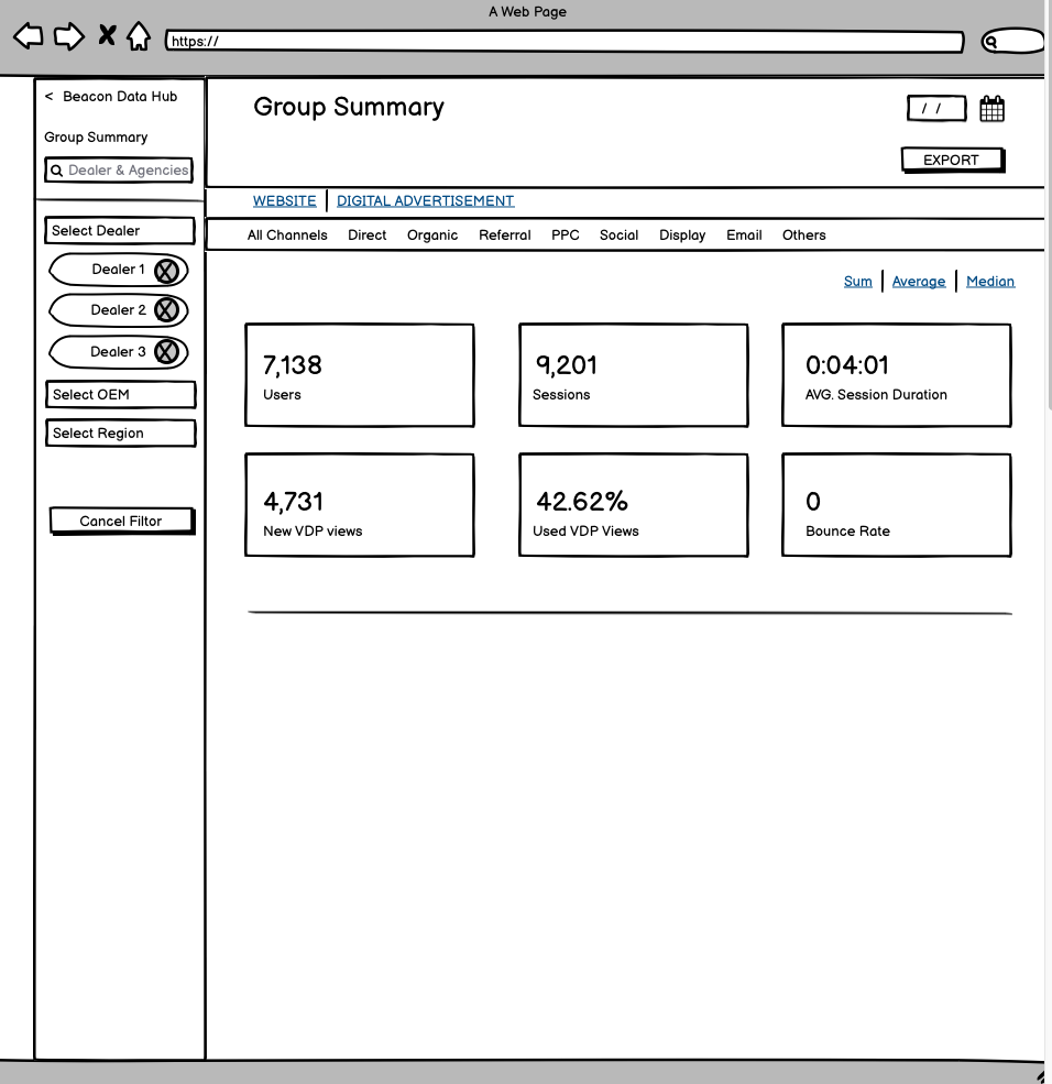 Overall I needed a page that summarises, the averages, and generates the median values of KPIs for dealer groups, and sets of dealerships.